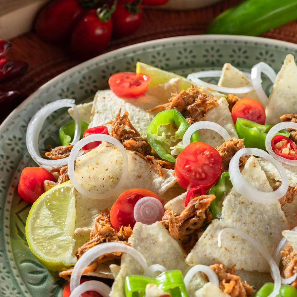 Riscaldare la carne sfilacciata del pulled pork in forno o in padella. Tagliare a fettine il cipollotto, la cipolla rossa, l’avocado, i pomodorini e l’jalapeño. Disporre i nachos sul piatto, cospargerli con gli ingredienti affettati, aggiungere il coriandolo tritato, la panna acida quindi distribuire il pulled pork sui nachos.